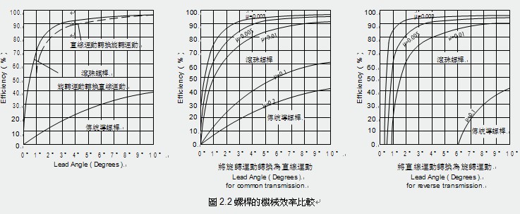 由于滾珠螺桿的螺桿軸及螺帽均是點(diǎn)接觸之滾動(dòng)運(yùn)動(dòng),所以其效率可高達(dá)90%以上。因此其傳動(dòng)扭矩僅只有傳 統(tǒng)導(dǎo)螺桿的1/3,由圖2.2可看出滾珠螺桿的機(jī)械效率遠(yuǎn)高于傳統(tǒng)導(dǎo)螺桿。