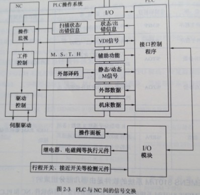 ????SIEMENS 810T/M“系統(tǒng)自帶一個(gè)集成式PLC,用于實(shí)現(xiàn)系統(tǒng)與機(jī)床的接口和電氣邏輯控制。集成式PLC就是數(shù)控裝置沒(méi)有單獨(dú)的PLC的CPU,硬件上與NC不能分離,不屬于某型號(hào)的PLC與NC實(shí)現(xiàn)接口或者通信而構(gòu)成系統(tǒng)的模式.編程語(yǔ)言采用SIEMENS SIMATIC S5系列PLC的語(yǔ)言STEPS. PLC與NC間的信號(hào)交換如圖2-3所示。