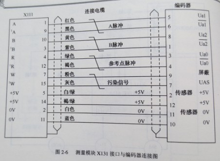??如圖2-4所示,SIEMENS 81OT/M系統(tǒng)也是通過測量模塊接收位置反饋信號的,一個測量模塊塊可以連接三個軸的位置反饋。測量模塊上面三個X111. X121和X131接口是連接位位置反饋的.圖2-6為測量模塊接口X131與編碼器的連接圖。另兩個接口X111和X121與X131是相同的。使用時要注意這三個接口的順序。