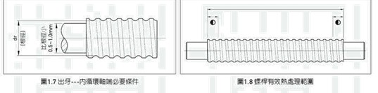 (9)滾珠絲桿熱處理時于靠近肩部加工的螺紋牙部份有10~20mm長度須保持軟 化,以便于加工肩部。此區(qū)域會標(biāo)示記號于HIWIN圖面上,如圖1.8。如您有 特殊之要求請與HIWIN連繫。
