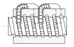 此種型式是由鋼珠沿著內(nèi)循環(huán)循環(huán)器溝槽,斜斜的越過螺桿牙峰,回來到原點。一般為一捲鋼珠一次循環(huán)。 此種型式螺桿至少要有一端是完全通牙,適用于螺桿徑小,採用金屬循環(huán)器。