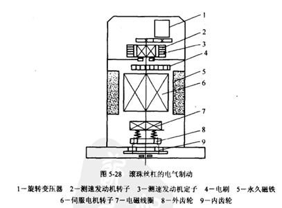 位于垂直位置的滾珠絲杠的制動方式,目前常見的有機(jī)械式和電氣式兩種。電氣方式制動是采用電磁制動器,而且這種制動器就做在電機(jī)內(nèi)部。圖5.28所示為FANUC公司伺服電機(jī)帶制動器的示意圖。機(jī)床工作時,在制動器線圈7電磁力的作用下,彈簧受壓縮,齒輪8與內(nèi)齒輪9脫開,當(dāng)停機(jī)或停電時,電磁鐵失電,在彈簧恢復(fù)力作用下,齒輪8、9嚙合,齒輪9與電機(jī)端蓋為一體,因此與電機(jī)軸連接的絲杠得到制動,這種電磁制動器裝在電機(jī)殼內(nèi),與電機(jī)形成一體化的結(jié)構(gòu)。